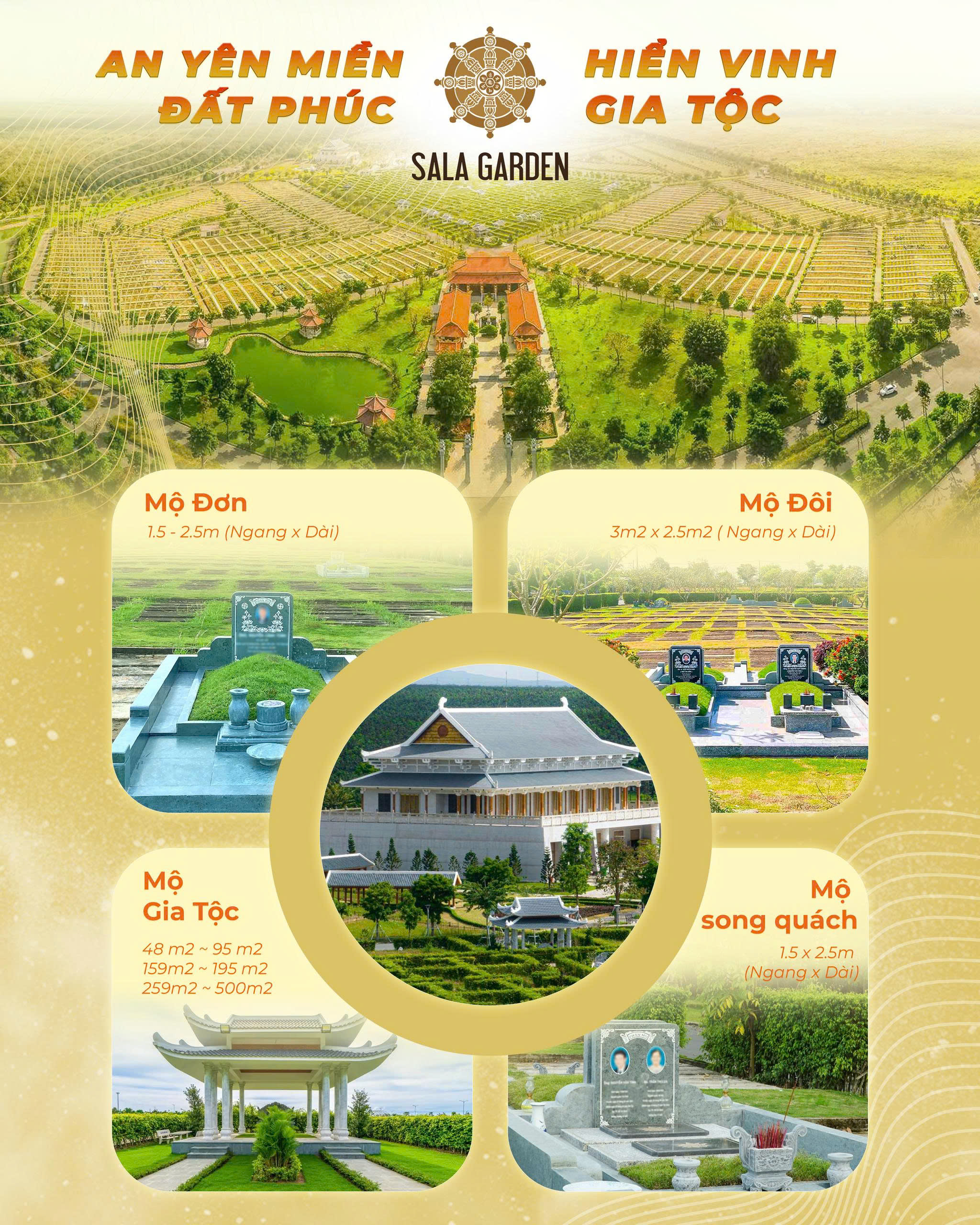 Mộ đại gia tộc Sala Garden với diện tích 96m2 đến 159m2 cho một khu mộ. Thiết kế nhà mái kép với khuôn viên cây xanh phong phú rộng mát, nằm ở những vị trí 2 mặt tiền, 3 mặt tiền với view tràn tầm mắt, số lượng khan hiếm. Thiết kế đẳng cấp với đôi tượng lân sư ở cổng vào. Có thế xây dựng thêm nhà mái tùy theo nhu cầu của gia chủ.
